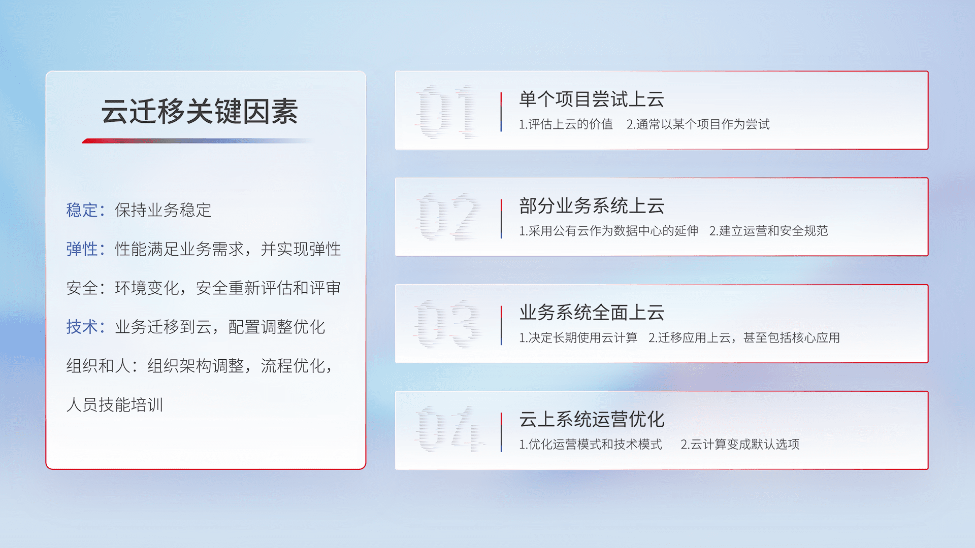 结合实际业务,,,从规划设计、、、、云平台选型、、、、云原生改造、、数据迁移、、、、集成交付,,,迁移全过程为客户识别最佳上云路径,,,做好风险识别管理,,,,设计网络架构、、身份权限、、安全审计合规、、操作审计、、、日志审计、、监控告警策略、、、、多站点容灾设计等,,对云上基础设施进行整体规划,,,,提升IT治理水平,,,以满足弹性、、高可用、、、、高性能的需求。。。。