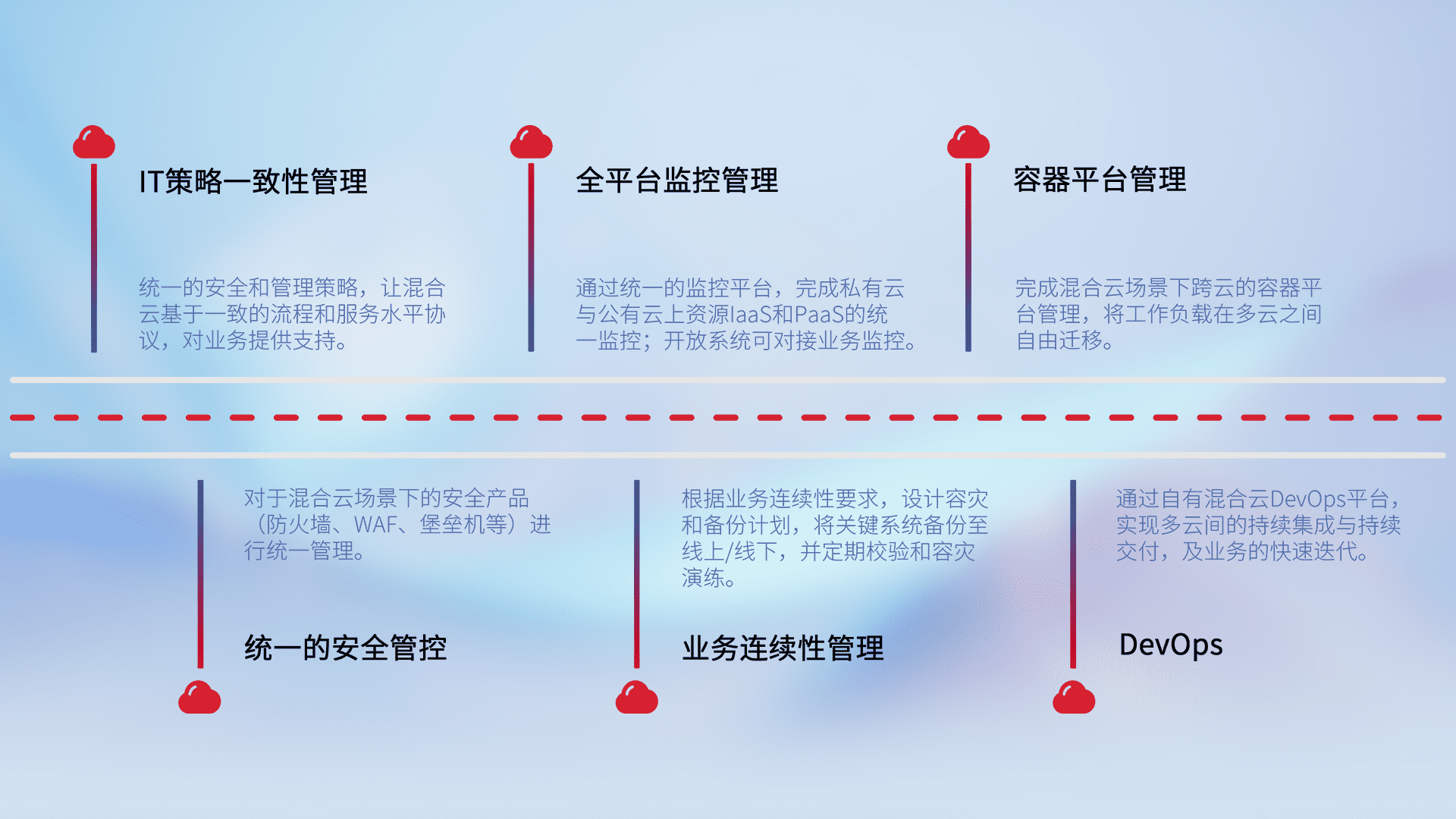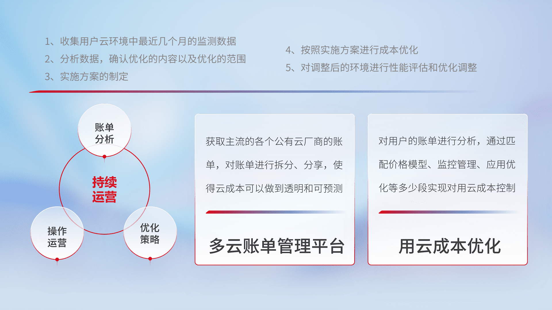 通过多云纳管,,,以统一的资源数据模型把客户的云资源进行抽象和封装,,,进而实现对多云资源的统一操作,,,,保障云资源管理的可靠性、、、稳定性与可用性。。。量身定制化运维内容,,,,配置、、开发运维、、补丁管理、、备份、、、监控、、、、认证和访问管理、、审计和日常巡检等,,,,保障在用云过程中的可靠度,,稳定度以及高可用率。。。
